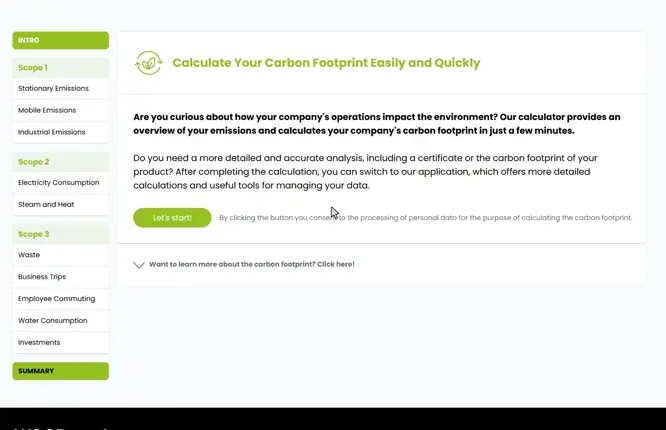 Uygulamamızın temeli, işletmenin Scope 1, 2 ve 3'teki karbon ayak izinin hesaplanmasıdır. Asistansız olarak işletmenizin karbon ayak izini sadece 390 EUR'ye hesaplayabilirsiniz. Ayrıca, yardımcı metodik tablolarımızı ve minimal desteğimizi kullanarak (790 EUR) hesaplamanın doğruluğunu teyit eden bir sertifika alabilirsiniz.